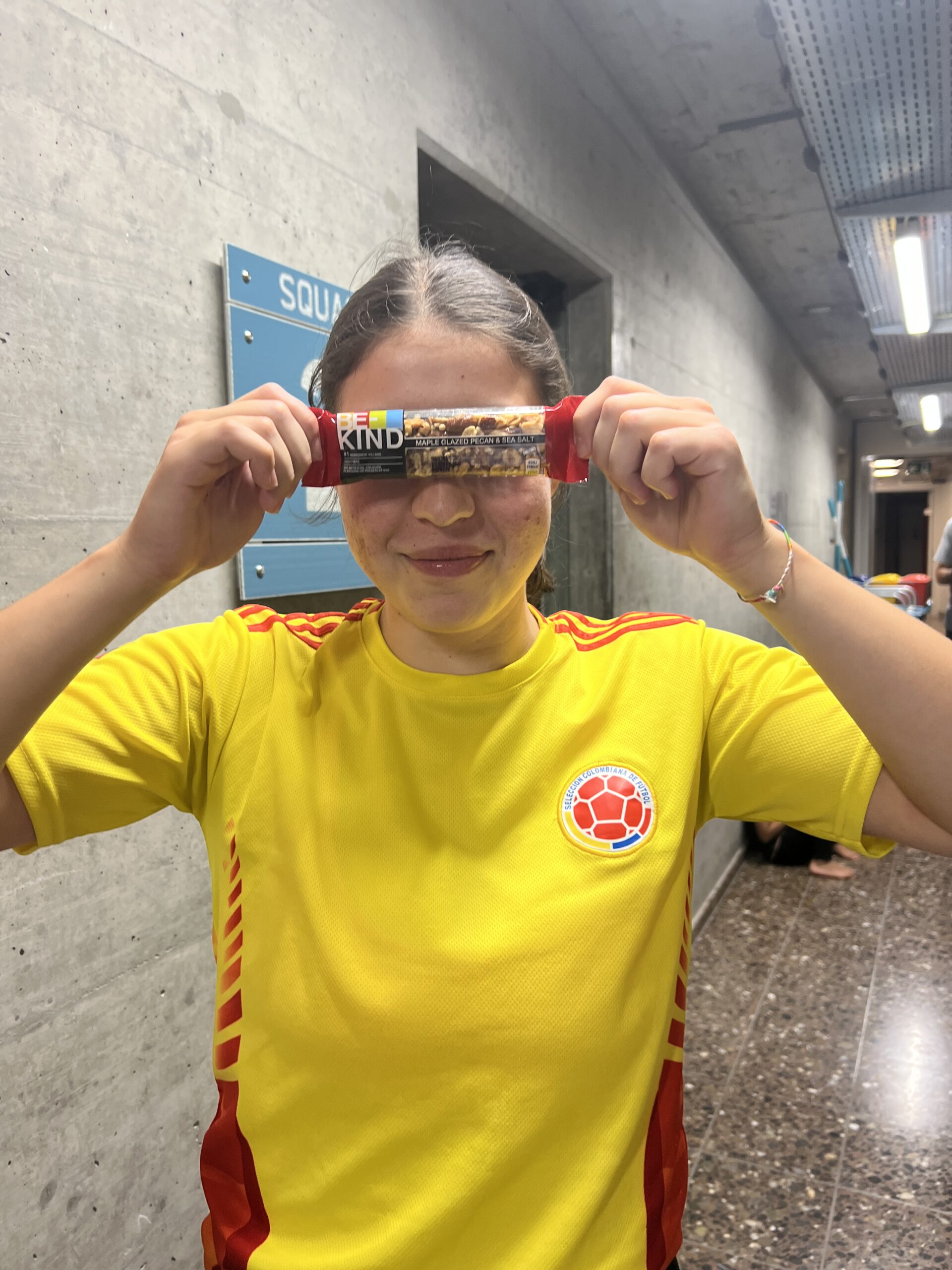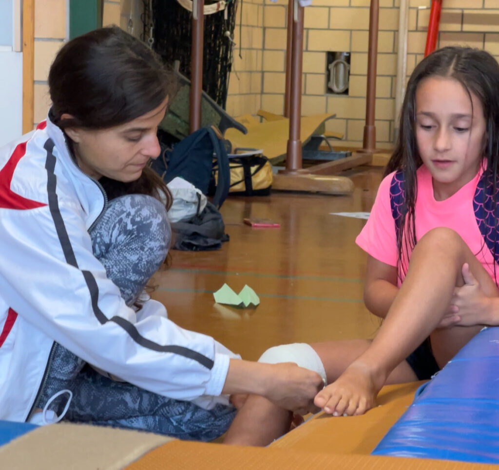 Auch das dritte Gerät „Airtrack“ war komplett neu für uns. Wir hüpften auf der riesigen „Luftmatratze“ zuerst wie PopCorns, übten dann Rollen und Räder und wagten uns dann voller Euphorie auch noch an den FlicFlac. Yaël landete dabei unglücklich auf dem Knie, das sofort anschwoll und blau wurde. Kurz darauf passierte dasselbe auch Marysol, nur dass ihr Knie nicht ganz so doll anschwoll. Zum Glück gab der Physiotherapeut im Haus Entwarnung: Prellungen, die mit dem „Zauberverband“ in ein, zwei Tagen wieder verheilt sein sollten. Trotzdem waren die Schmerzen höllisch und Yaël war voller Kummer, weil sie glaubte, nicht mehr turnen zu können.