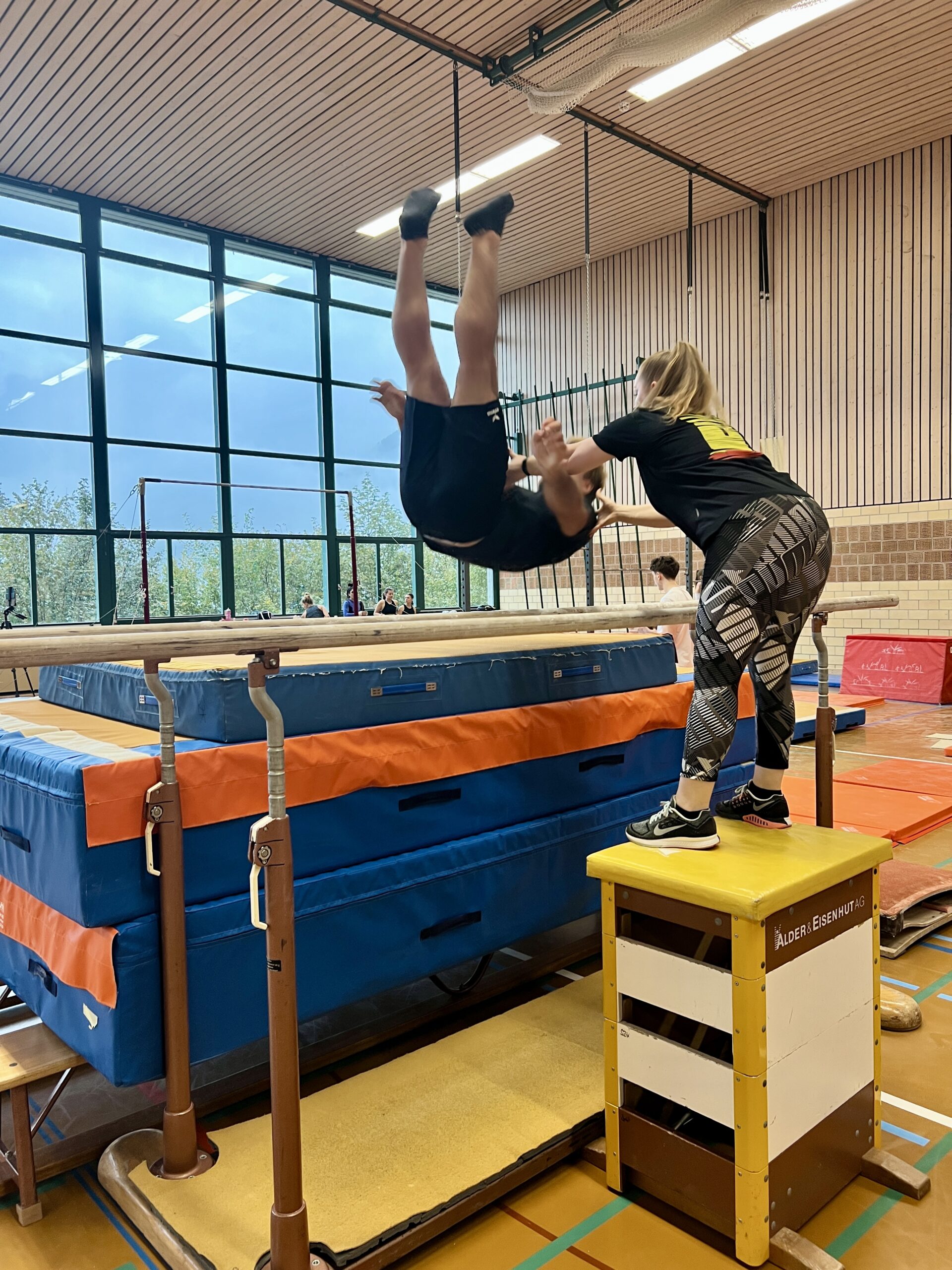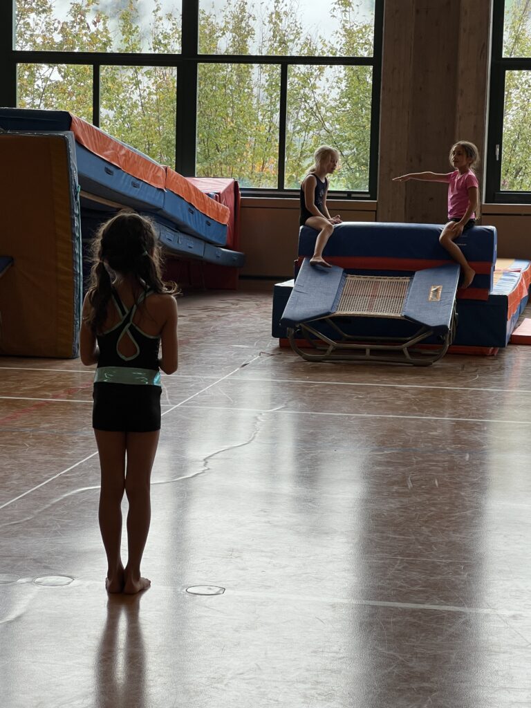 Obwohl wir erst spät eingeschlafen sind, waren wir schon wieder früh wach und ganz hibbelig, endlich mit dem Training starten zu können. Nach dem Frühstück und dem Einturnen startete unsere Gruppe am Sprung, wo wir nach ein paar der gewohnten Sprüngen mal auf dem Minitramp ausprobieren durften. Das spickte uns einiges höher, als wir es gewohnt waren und machte grossen Spass.