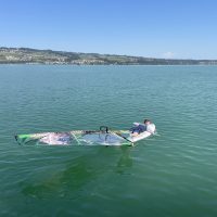Und schliesslich wurden wir in den See entlassen. Die Windsurfboards wurden gewassert und die Segel vom Steg aus auf das Brett gesetzt. So wurden wir angewiesen, das Segel auf dem Board abzulegen und liegend auf den See hinauszupaddeln, entgegen der Windrichtung (wichtig!). In Begleitung der Instruktoren zogen wir zum ersten Mal die Segel auf. Es geschah genau das, was wir an Land bereits besprochen hatten. Das Segel richtete sich mit dem Wind aus und stellte das Surfbrett somit senkrecht zur Windrichtung. Nun konnte das Segel wie eine Tür gedreht werden, um Fahrt aufzunehmen, … wenn man zu diesem Zeitpunkt noch auf dem Brett stand ;-).