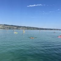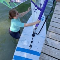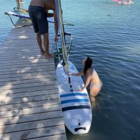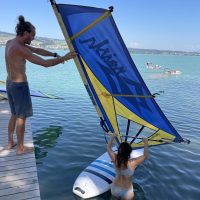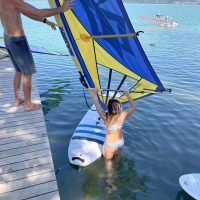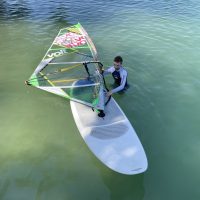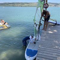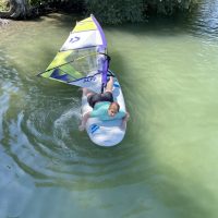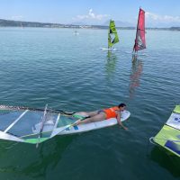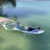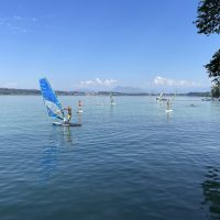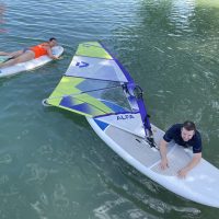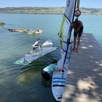Mit ein wenig Übung gelang es uns dann bei leichtem Wind auf dem See zu surfen und nicht allzu weit vom Übungssektor abzutreiben, um dann zum Ende hin geschickt an den Steg zurückzusegeln.