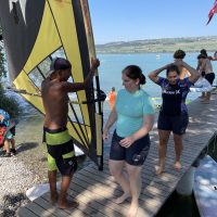 Die nächsten Stunden verbrachten wir mit einem Windsurf-Schnupperkurs. Die Instruktoren gaben nach einem kurzen Überblick auch gleich den ersten Auftrag: Die Surfbretter und Segel mussten bereitgelegt werden. In einer langen Polonaise Schlange aus Turner:innen und Brettern wurden diese an das Seeufer transportiert.